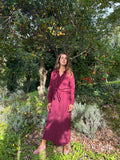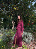 The lightweight silk ensures a graceful, comfortable fit, while the front slit subtly reveals the legs as you move.