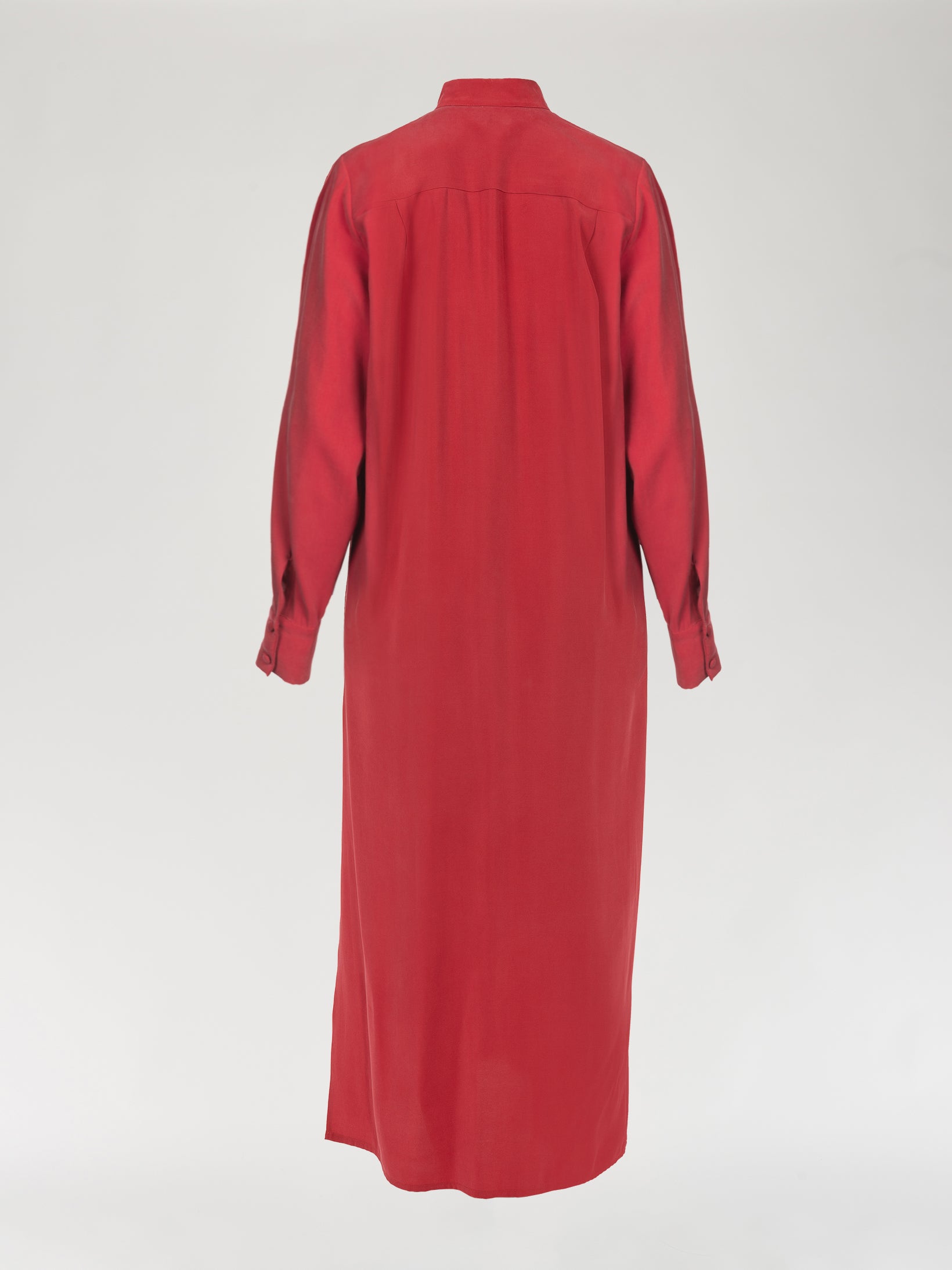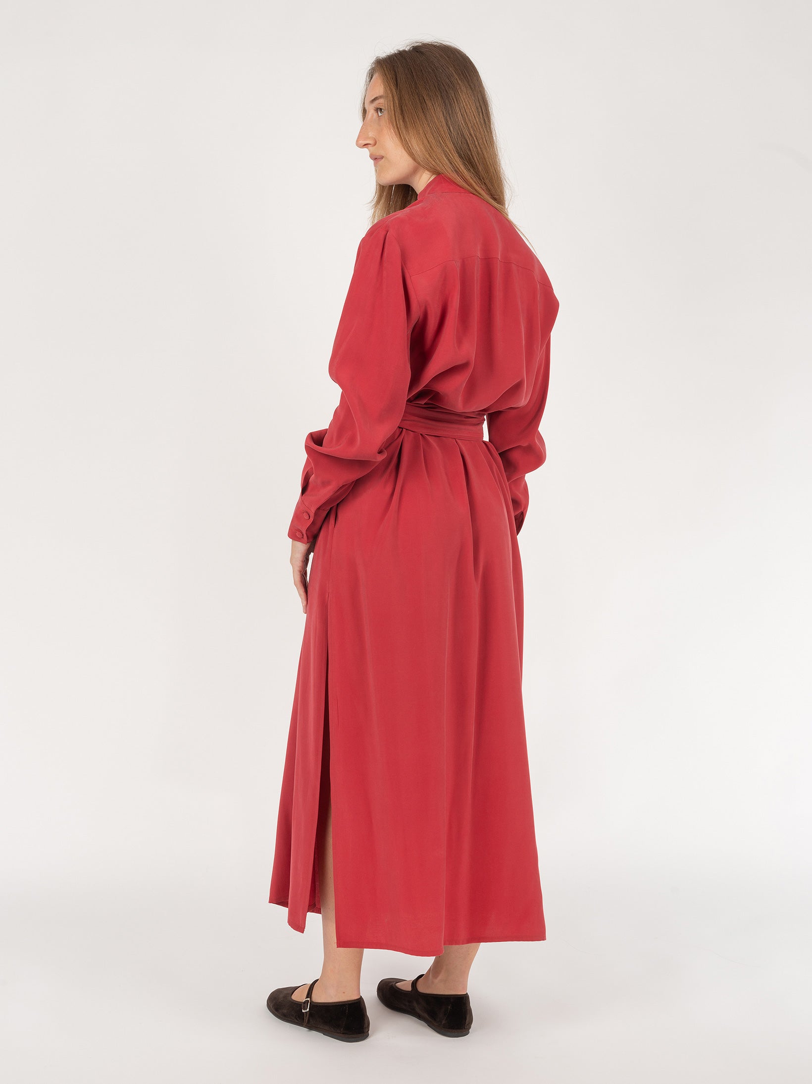 A truly versatile piece—perfect worn as a dress with or without the belt, or layered open over our cupro or velvet trousers for a more relaxed, contemporary look.