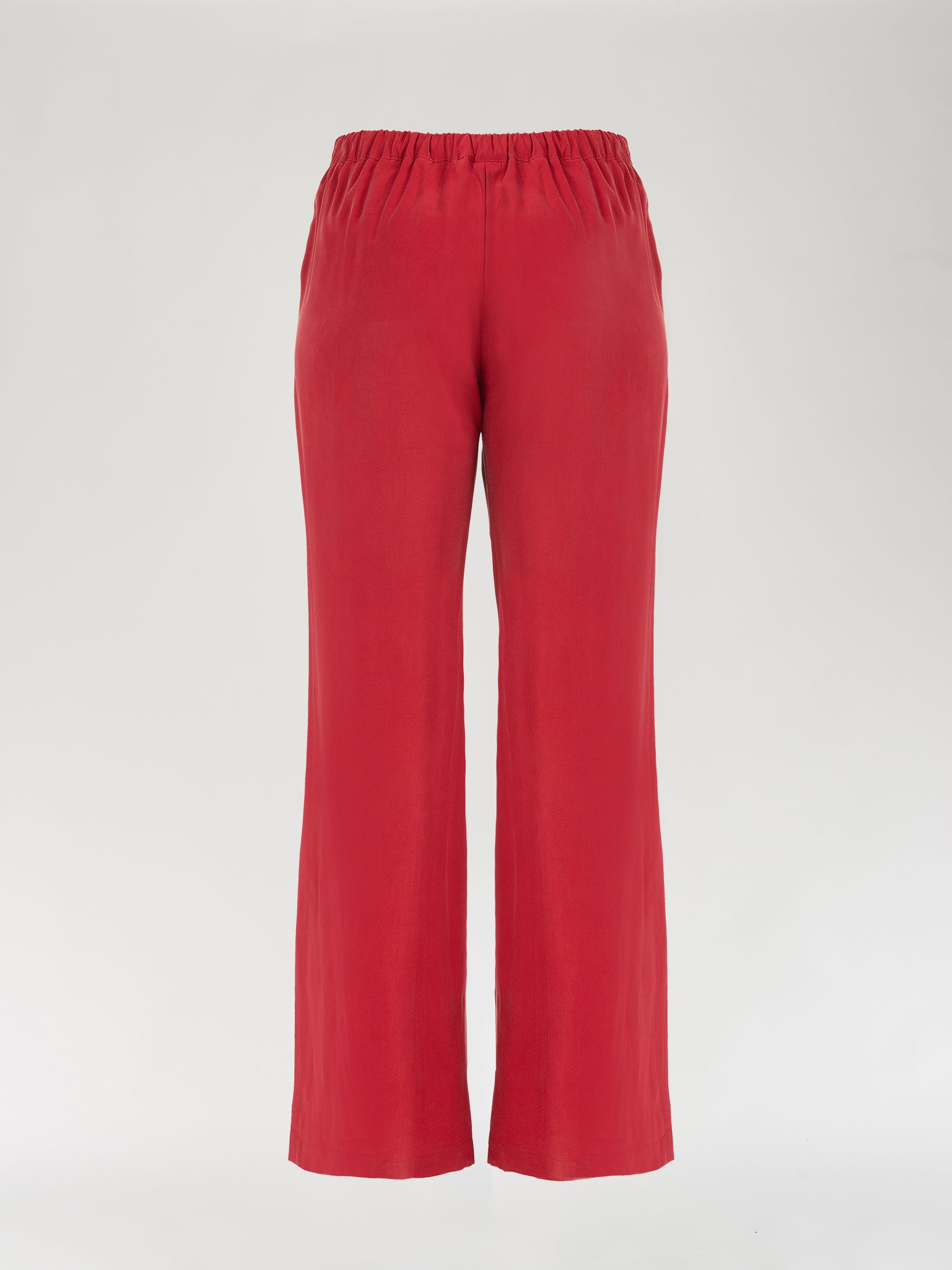 These 100% cupro trousers, also known as vegan silk, feature a straight-leg cut and a mid-rise waist with discreet side pockets for a clean and refined look. The comfortable fit is enhanced by an elasticated back waistband and a concealed side zip, ensuring both practicality and ease without compromising on style.