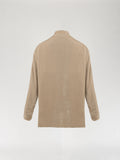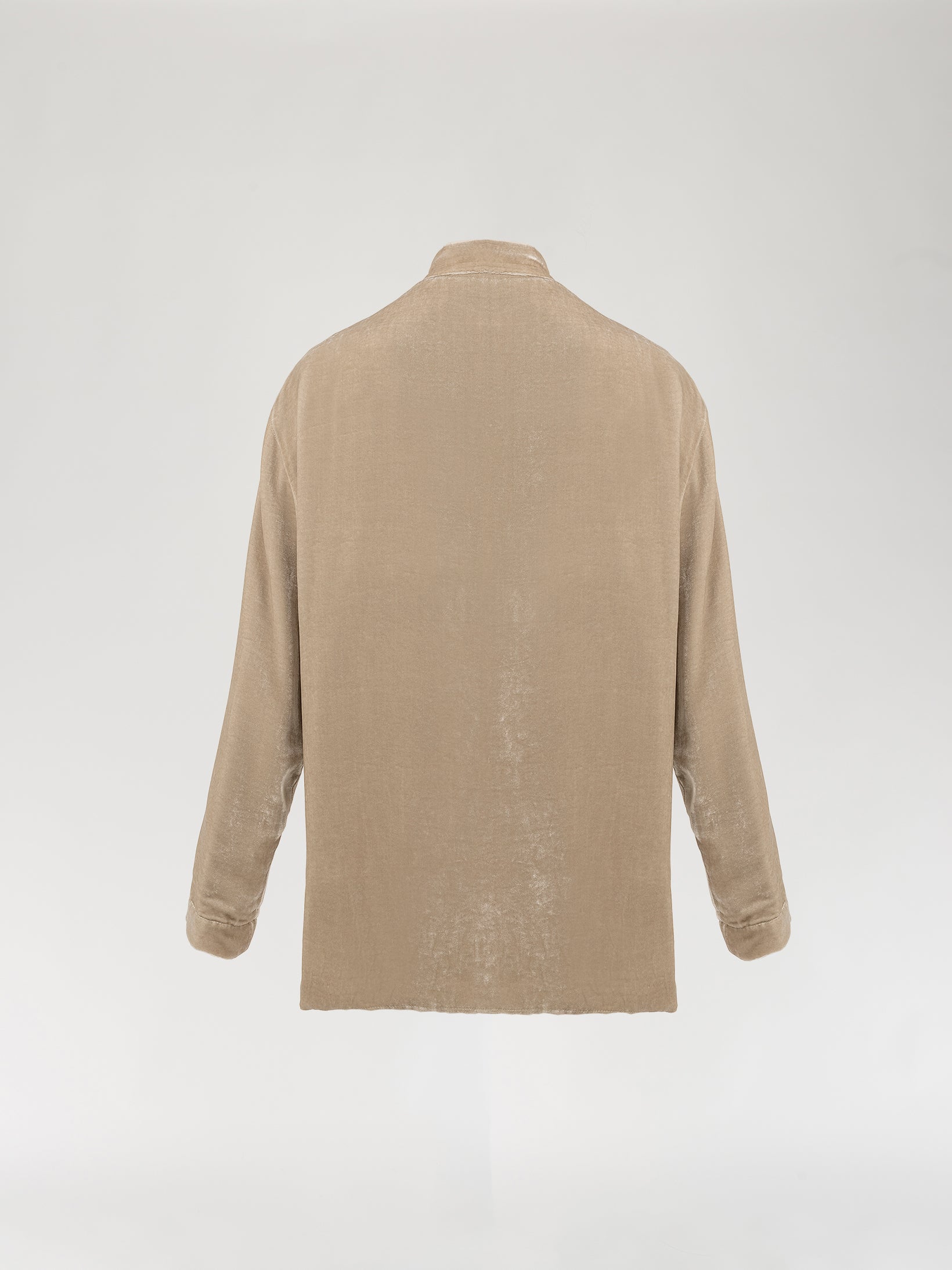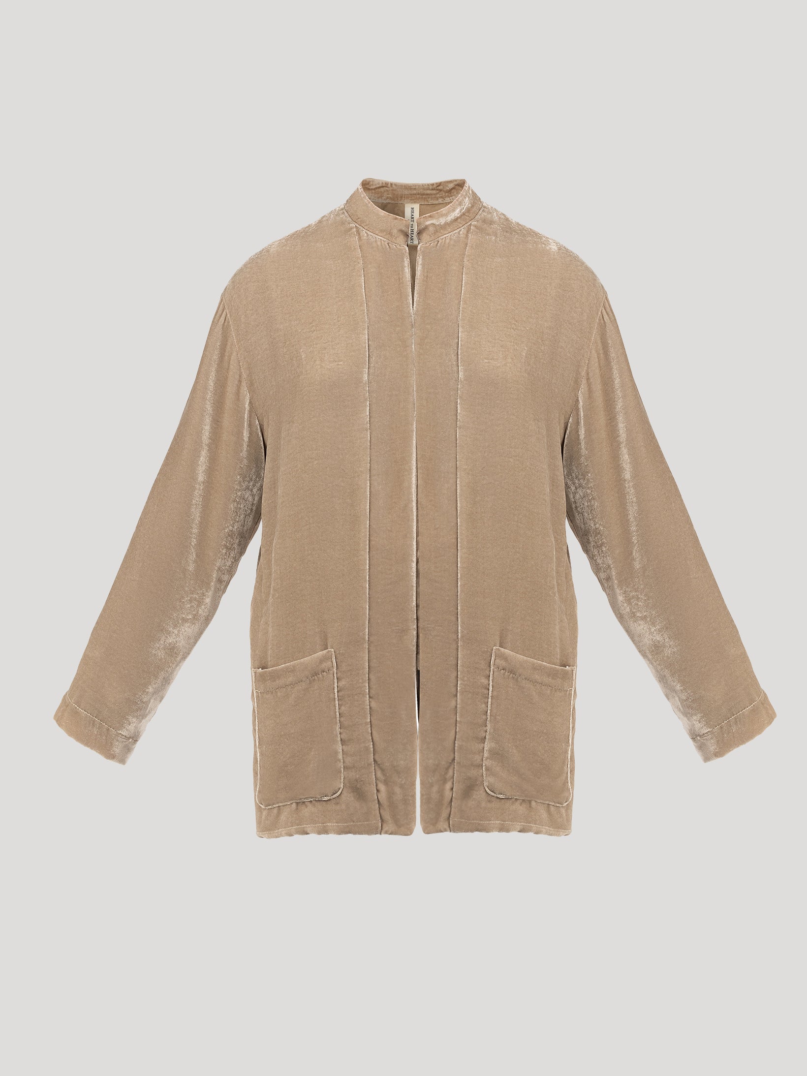 It features a refined mandarin collar and a rich, tailored cut that brings sophistication to any look. Practical details such as welt pockets and small side vents at the hem lend it a touch of relaxed elegance.