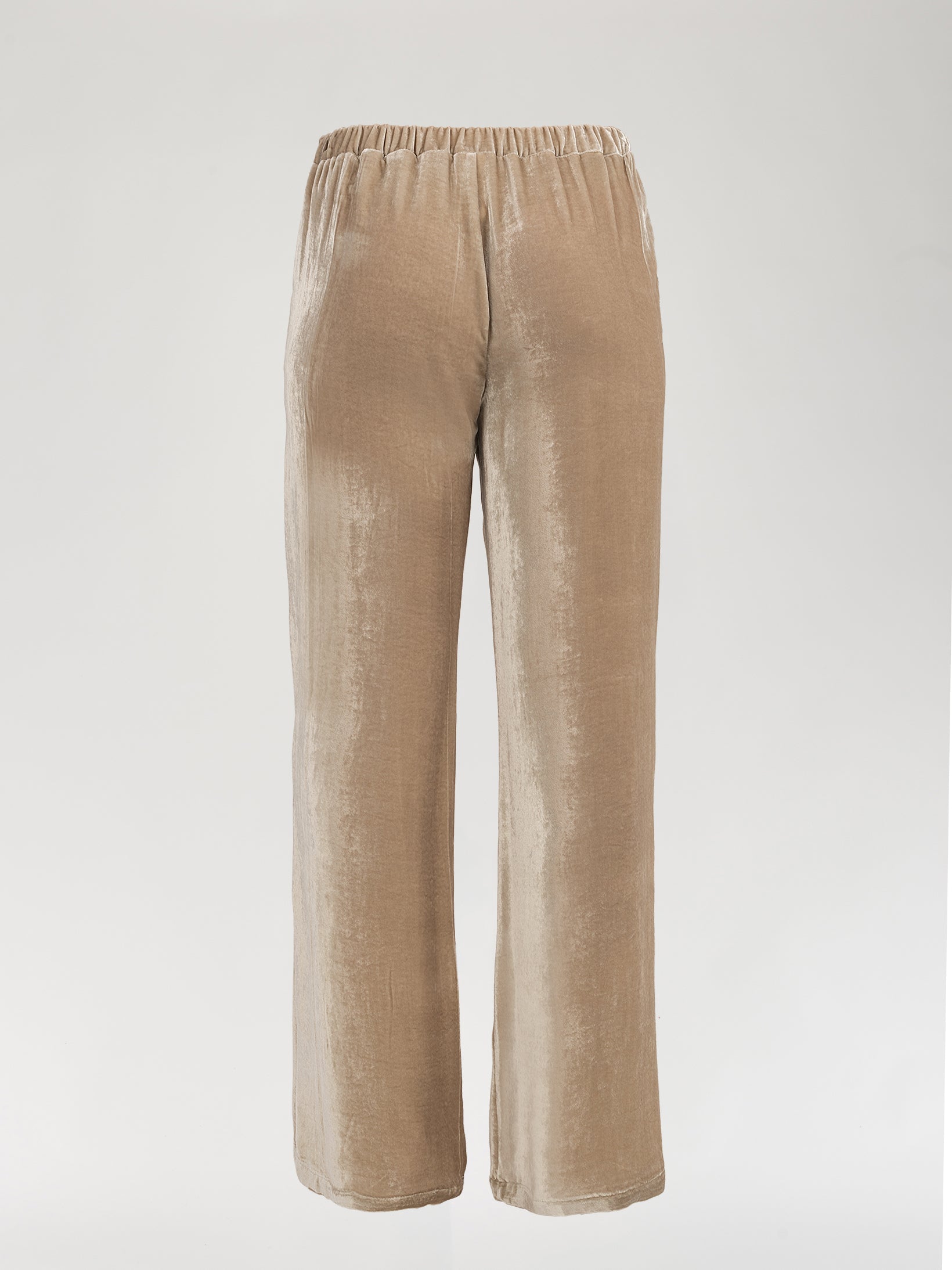 Tailored from a soft silk-viscose blend, these trousers feature a straight-leg silhouette and a mid-rise waist, with discreet side pockets for a clean and refined look. The comfortable fit is enhanced by an elasticated back waistband and a concealed side zip, offering ease and practicality without compromising on style.