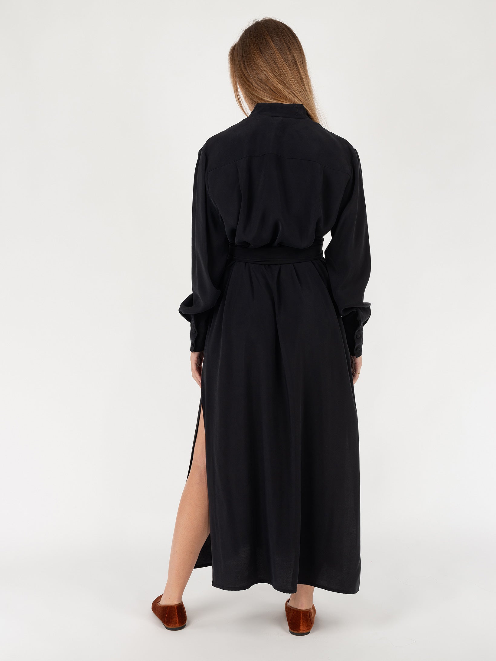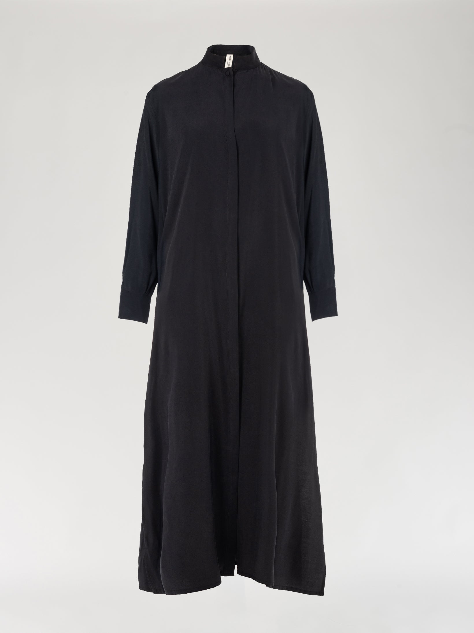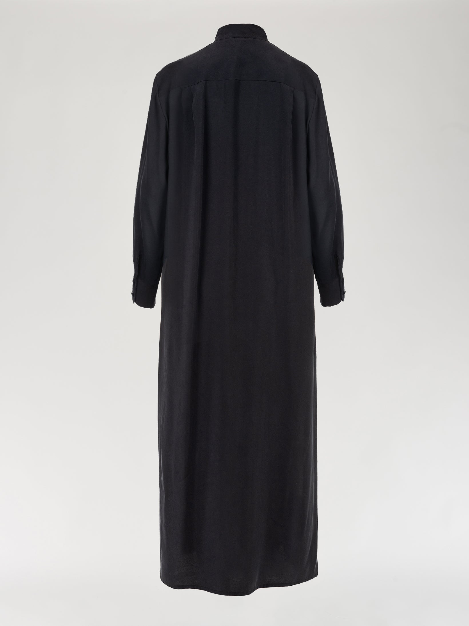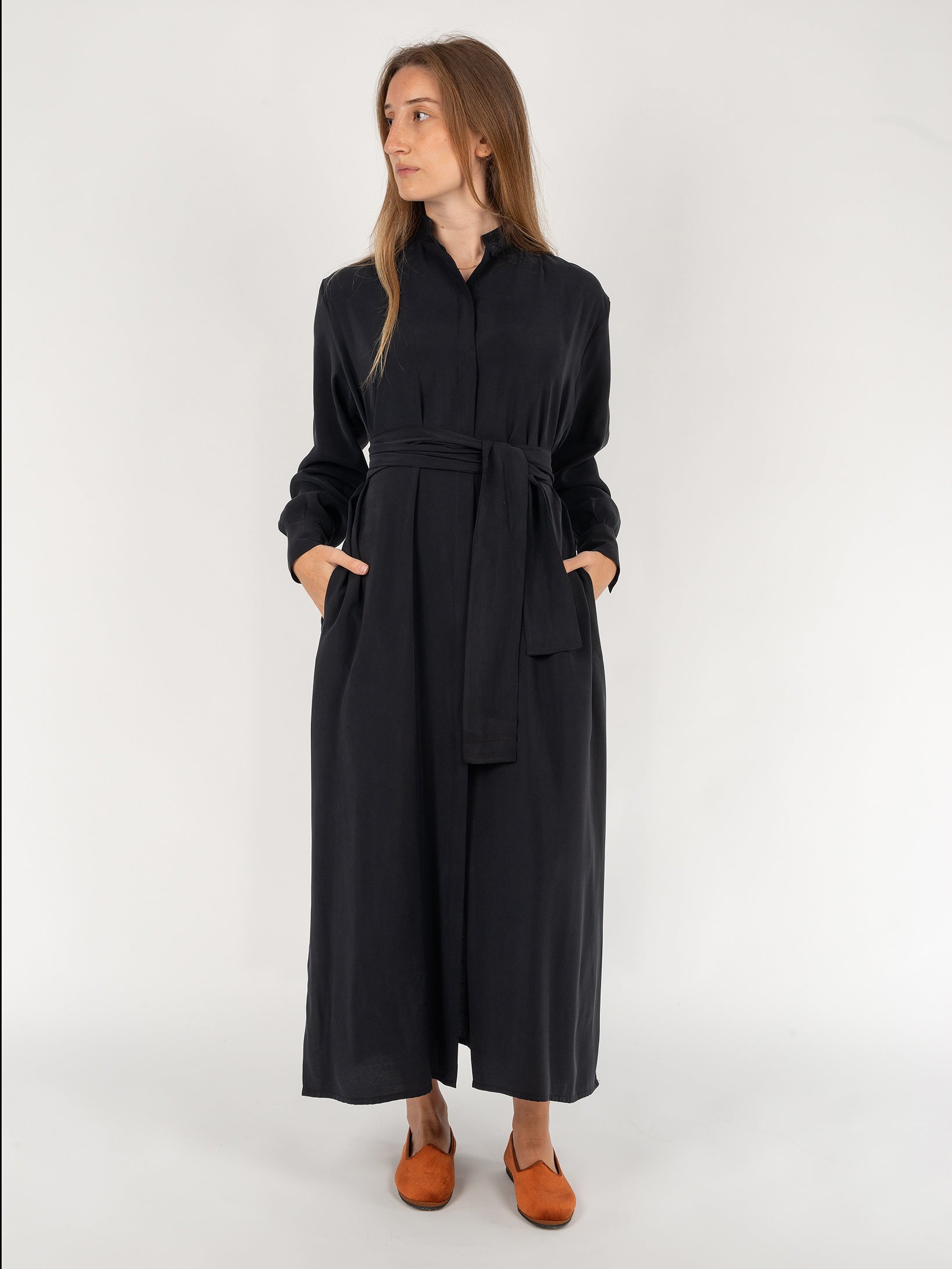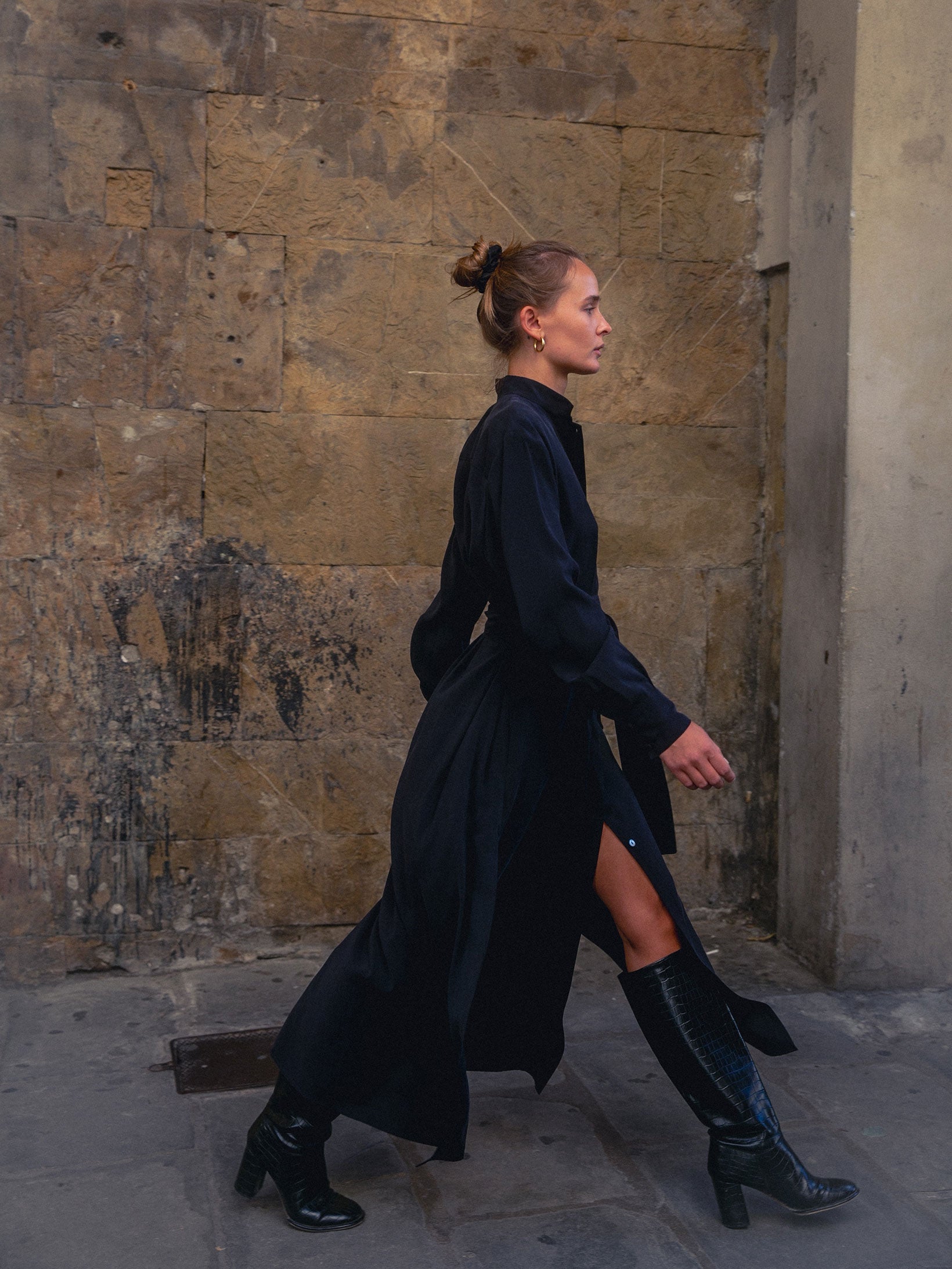 A truly versatile piece—perfect worn as a dress with or without the belt, or layered open over our cupro or velvet trousers for a more relaxed, contemporary look.