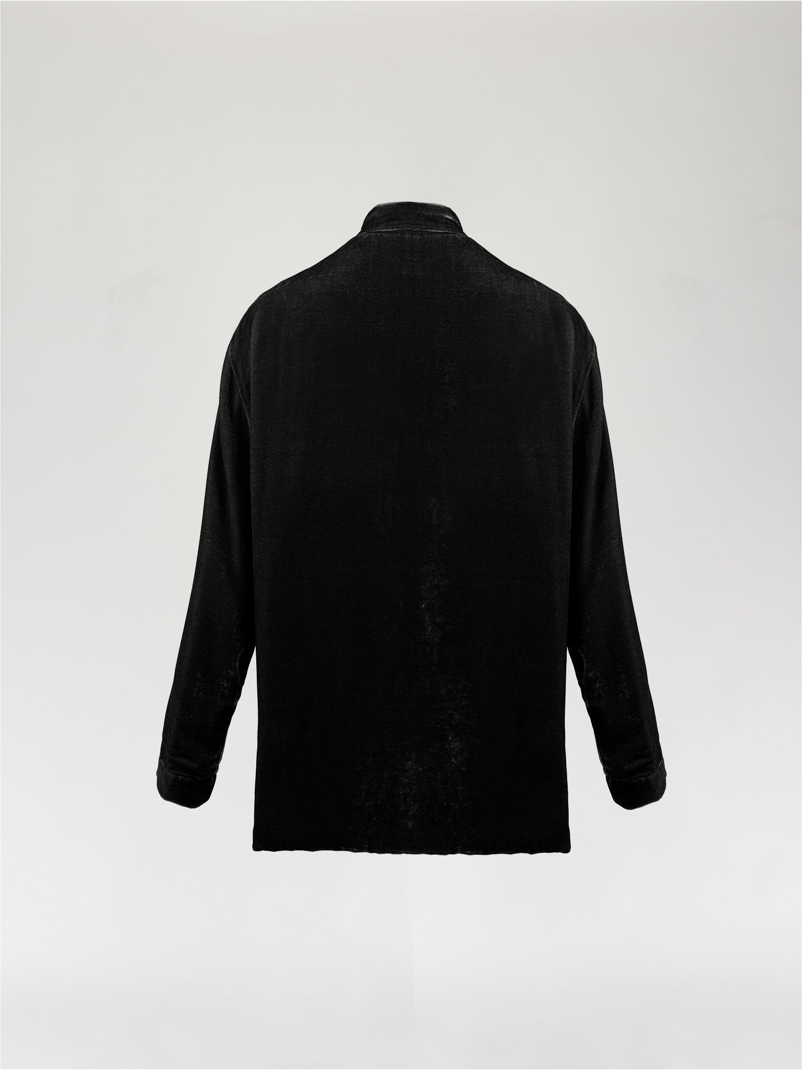 It features a refined mandarin collar and a rich, tailored cut that brings sophistication to any look. Practical details such as welt pockets and small side vents at the hem lend it a touch of relaxed elegance.