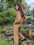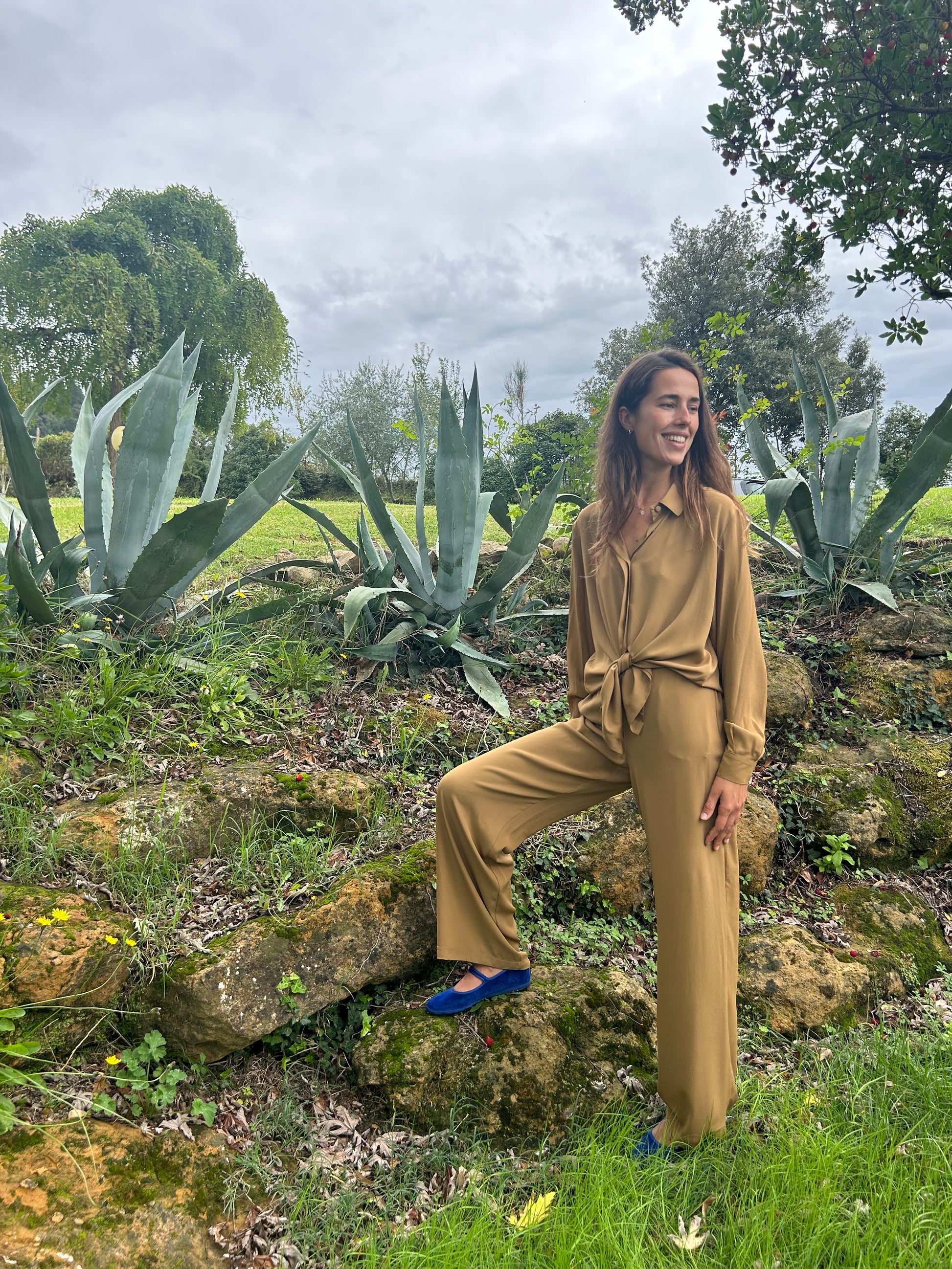 Our silk trousers feature a straight cut and a mid-rise waist. Their comfortable fit is enhanced by an elasticated back waistband and discreet side pockets, offering both practicality and ease.