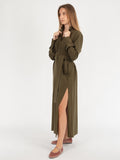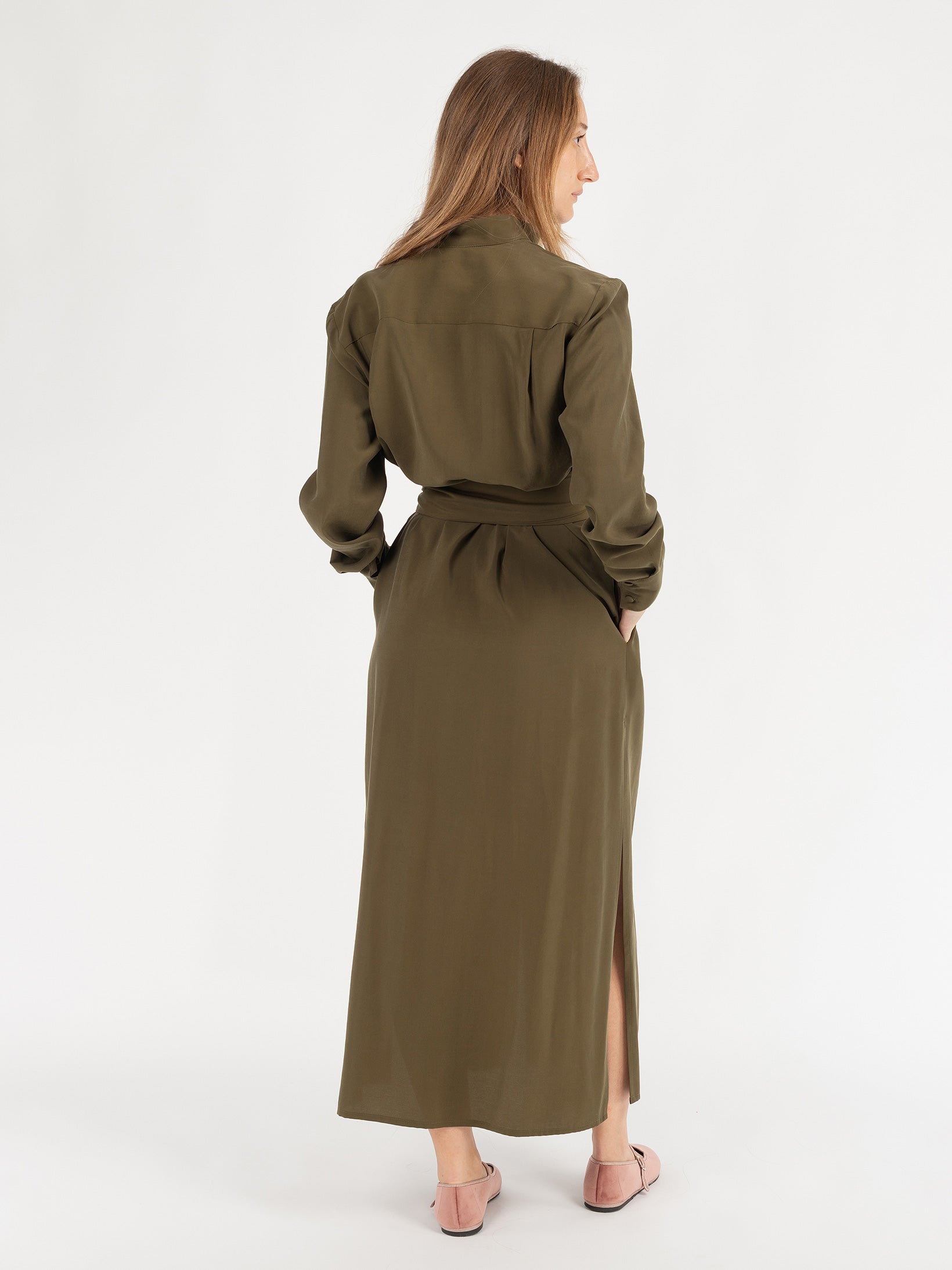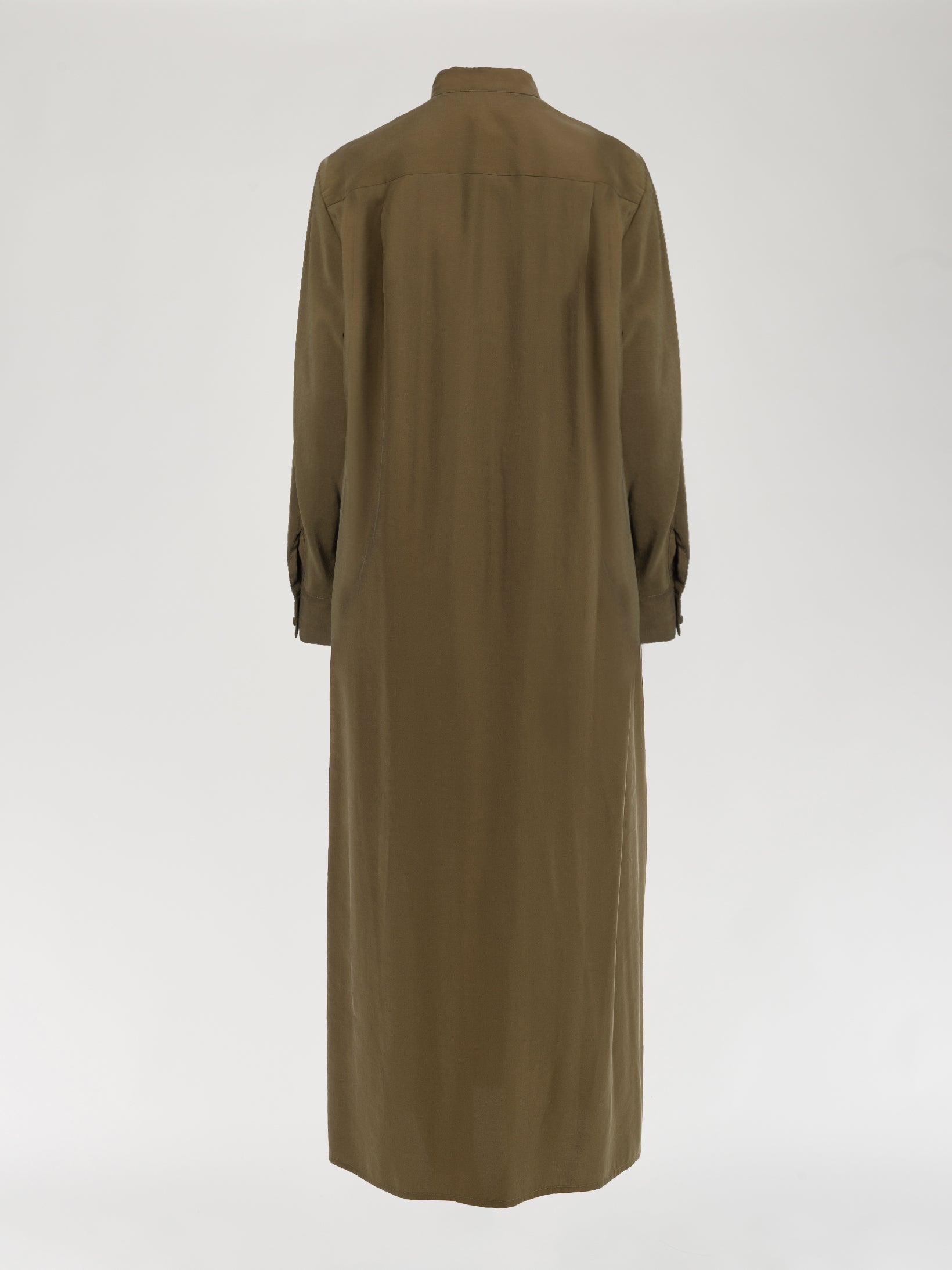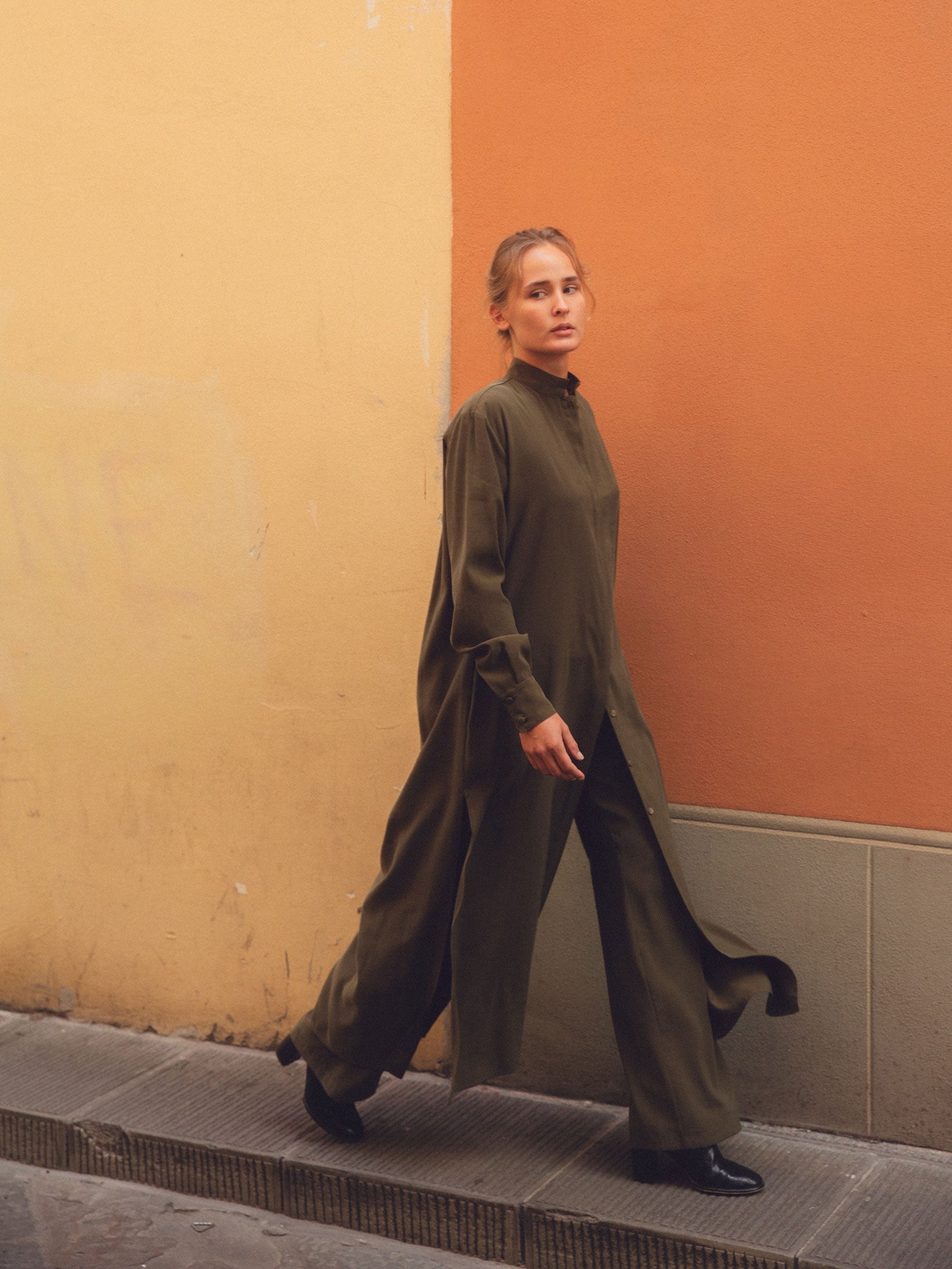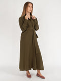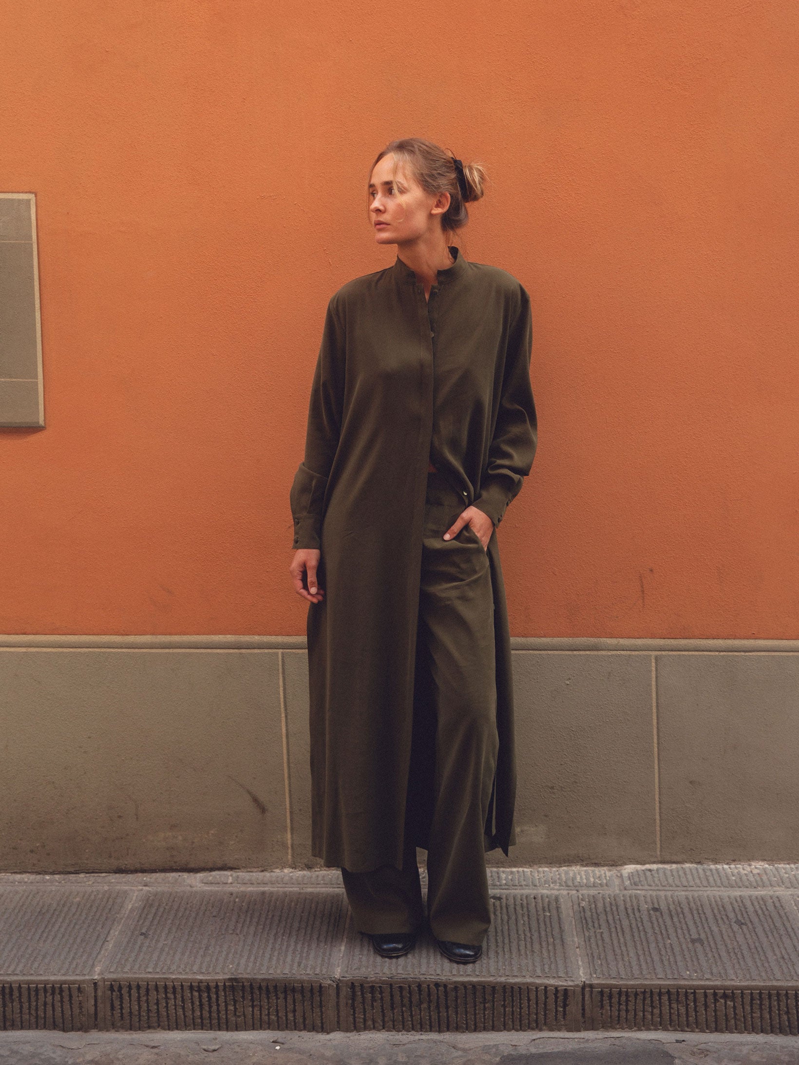 A truly versatile piece—perfect worn as a dress with or without the belt, or layered open over our cupro or velvet trousers for a more relaxed, contemporary look.